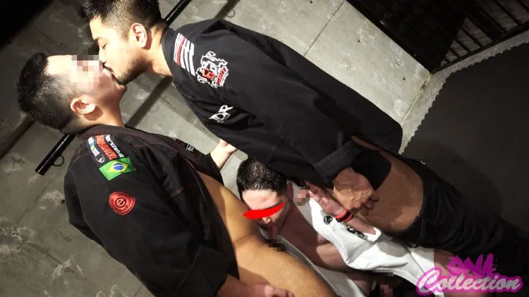ついに顔出し!188cm115kg30代の目隠し両手拘 束され身動き取れない土方パ⚪︎パに2人の柔術着の野郎達が襲いかかる!敏感乳首を弄られ勃起してしまい、男のキスと同時フェラで感じるノンケ。「気持ちいい…」
